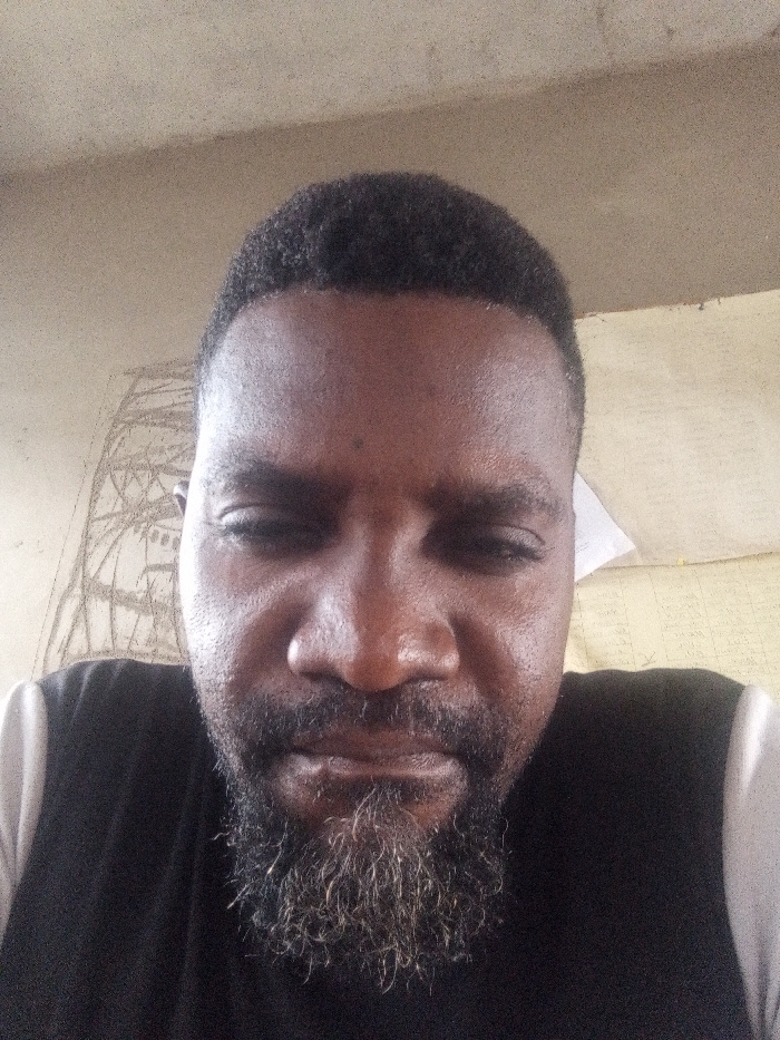 An adult male subject is depicted in a close-up, chest-up selfie, positioned indoors against a light-colored wall in the city of Unknown, Unknown