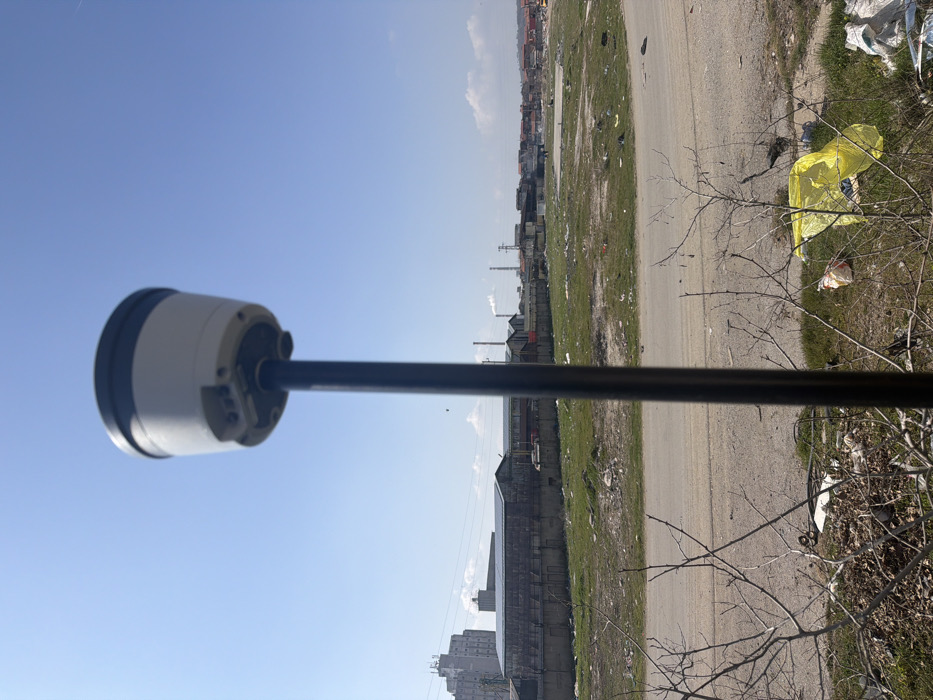 A forensic examination of the image reveals an outdoor scene in Sliven, Bulgaria, under a clear, bright blue sky with minimal scattered white clouds. The primary subject in the immediate foreground, slightly out of focus, is a white and dark gray cylindrical Global Navigation Satellite System (GNSS) receiver mounted vertically on a dark, slender pole, positioned centrally in the frame. The ground in the foreground consists of dry soil interspersed with sparse vegetation, including several bare, twiggy branches. Significant litter is visible, notably a crumpled bright yellow plastic bag and other assorted refuse. Extending horizontally across the midground is an unpaved dirt road or track. Beyond this, a large, irregular expanse of open ground is visible, characterized by patchy green and brown grass, bare earth, and widespread accumulation of refuse and debris. A relatively clear, flat, rectangular dirt area is visible within this expanse in the mid-right. The background features a distinct industrial landscape. To the left, a tall, multi-story light-colored concrete building, possibly a silo or factory, stands prominent. Adjacent to it are several lower, dark-roofed industrial structures, partially obscured by a concrete wall or fence line. Further right, an array of industrial facilities with multiple smokestacks is visible, some actively emitting plumes of white smoke. In the far right background, a cluster of numerous low-rise buildings and structures, appearing densely packed and less formally constructed, suggests a residential or informal settlement area adjacent to the industrial zone. No individuals or discernible activities are present in the scene.