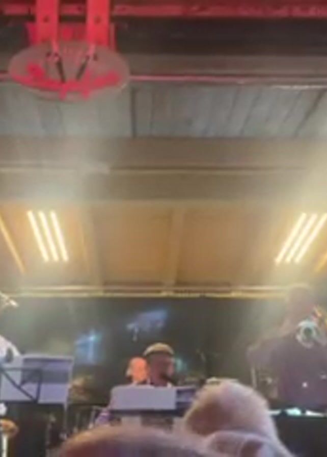 A band of six musicians plays on a stage under a wooden structure. The band consists of a tuba player, a man with a keyboard, and four trumpet players. The players are dressed in smart casual clothing. The venue is enclosed, possibly a bar or small concert hall, with warm lighting and an audience in the foreground. A decorative sign hangs above the stage. The band appears to be performing live music for the audience.