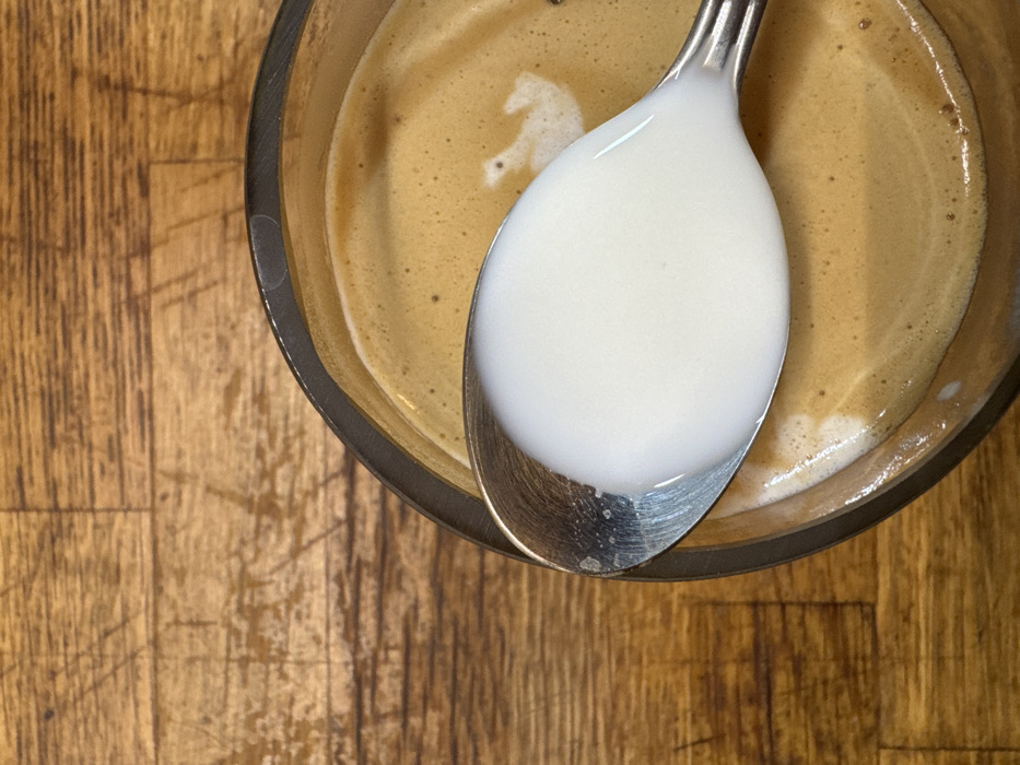 - "An overhead view captures a clear glass mug, approximately two-thirds full of a coffee beverage, resting on a light brown wooden surface" by FM-skTYr2, licensed under CC BY 4.0