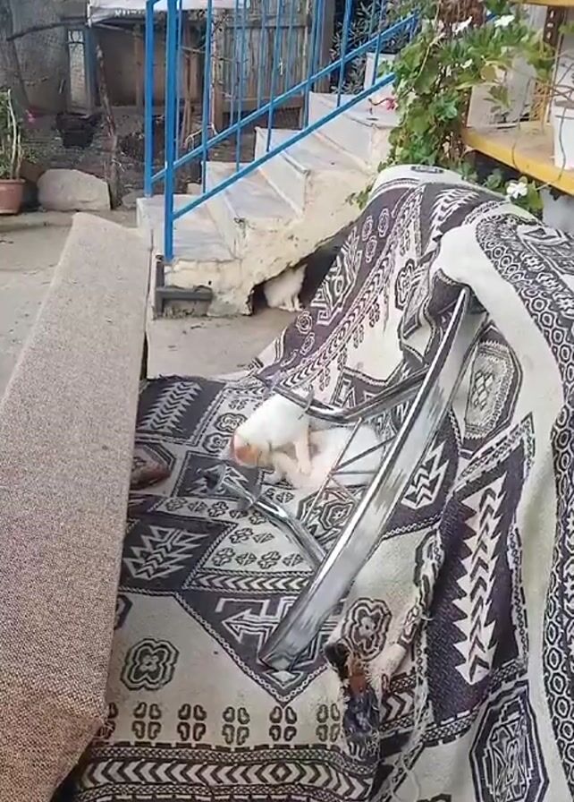 cluttered outdoor area with a few cats. In the foreground, there's a sofa partially covered with a patterned blanket. A metal chair frame sits on top of the blanket. A white and orange kitten stands on the sofa cushion. Behind the sofa, there are concrete stairs with a blue metal railing leading to an upper level. A white cat is visible under the stairs. In the background, there's a wire mesh enclosure and some vegetation. The overall scene is somewhat disorganized.