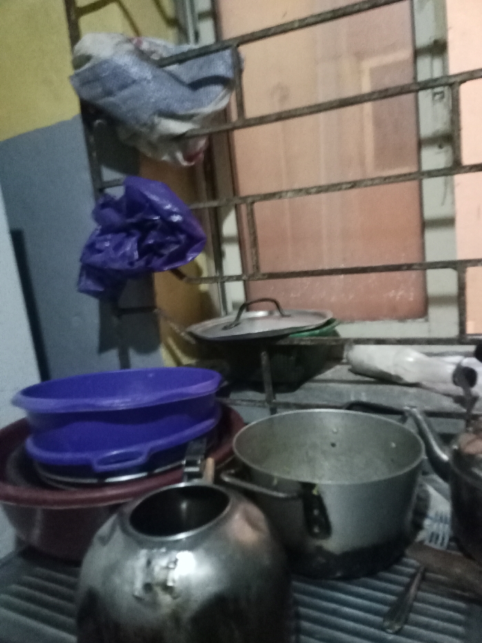 The image displays an indoor utility or kitchen area in the city of Unknown, Unknown. The foreground features a ribbed drying rack. On the left side of the rack, a dark red plastic basin is stacked with two blue plastic bowls, each featuring handles. To the right of these, a tarnished metallic kettle with an open top stands next to a large, dirty grey metallic pot equipped with dark handles. A portion of another metallic vessel and a white plastic bottle are visible further to the right, along with a metallic spoon resting on the rack. In the mid-ground, a dark pot covered by a silver lid with a black handle is positioned. The background consists of a metal security grille with horizontal and vertical bars. A bundled light-colored fabric item is suspended from the upper part of the grille, and a crumpled purple plastic bag hangs below it. Behind the grille, a reddish-brown door or wall is discernible, with a segment of a light-colored wall visible to the left. The scene is dimly lit. No individuals are present.