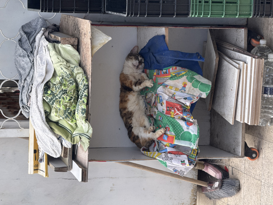 In the city of Bat Yam, Israel, an outdoor scene is depicted focusing on a makeshift shelving unit. A domestic cat, exhibiting a calico fur pattern with patches of white, brown, and ginger, is observed sleeping on its left side on the middle shelf of this unit. The cat rests on a multicolored blanket adorned with children's patterns; a folded blue cloth is positioned beside it. The shelving unit itself is a two-tiered, light-colored wooden or particle board structure, showing signs of wear and equipped with small orange caster wheels. The top shelf contains a jumbled arrangement of textiles, including a grey blanket, a white towel, and a green patterned fabric, alongside some loose wooden planks. The bottom shelf holds a stack of light-colored rectangular tiles or boards, with a clear plastic water bottle visible underneath. To the left of the unit, a wooden broom with a pink dustpan leans against a light-colored wall, its bristles resting on paved, light-colored tiles. To the right, a stack of black and green plastic utility crates is present. A partial view of a white, decorative metal security grille is visible in the upper background.