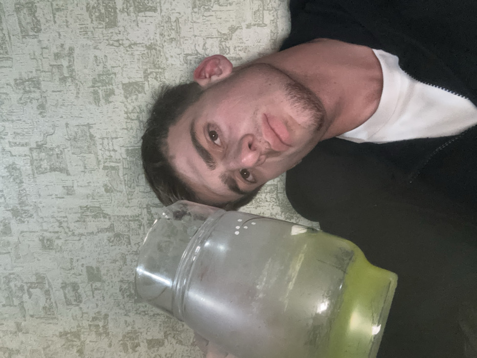 The image displays a young adult male holding a clear pitcher, captured in a close-up, slightly low-angle perspective