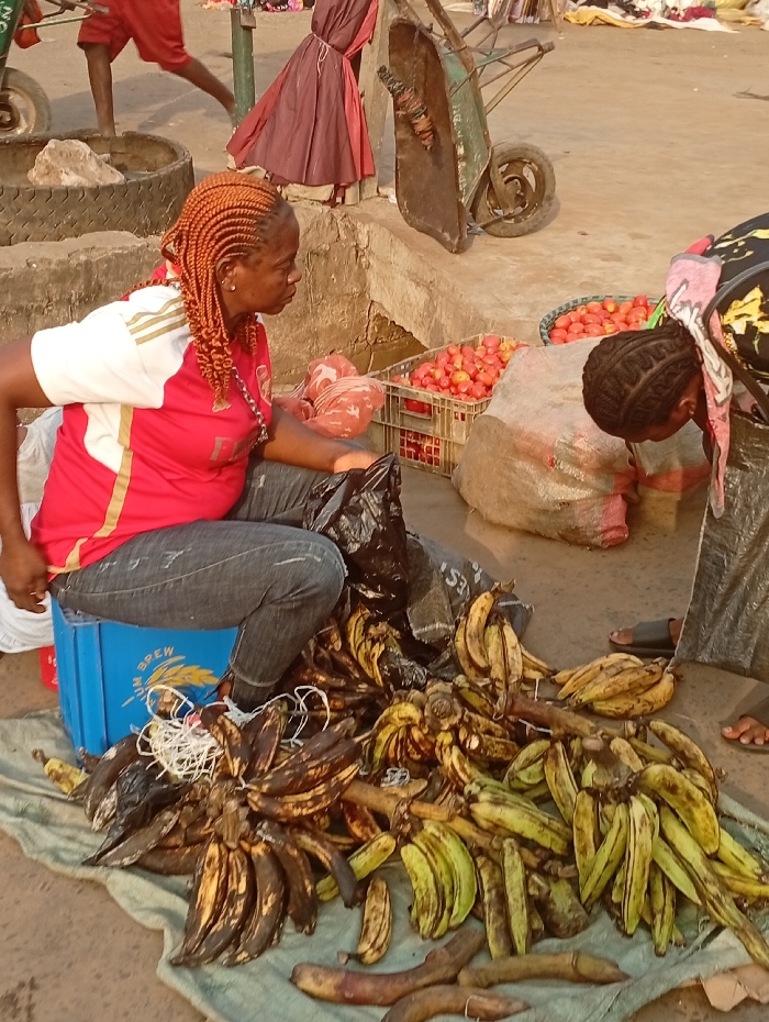 An outdoor market scene in Onitsha, Nigeria, depicts three individuals amidst various produce and market equipment on a concrete surface