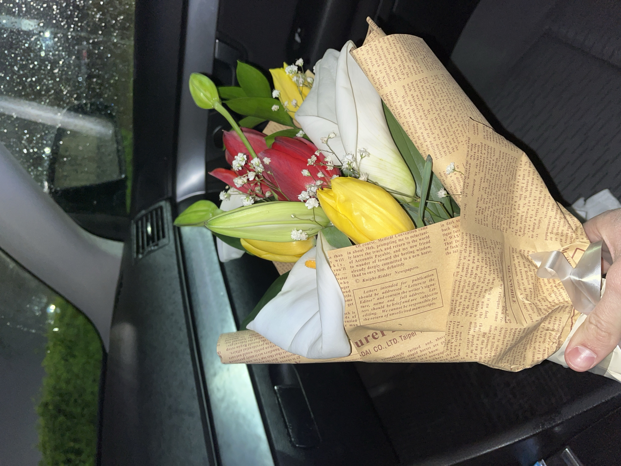 The image depicts a human hand holding a floral bouquet inside a dark-toned vehicle cabin. The bouquet consists of several white calla lilies, multiple red and yellow tulips, and sprigs of white baby's breath, integrated with green foliage and unopened buds. It is wrapped in light brown paper printed with English text, resembling newspaper, and secured at its base with a white or silver-colored ribbon tied into a bow. The visible interior elements include a dark dashboard, an air vent on the passenger side, and a dark, textured seat upholstery. Through the vehicle's windows, the exterior environment is dark and appears wet, with numerous water droplets visible on the glass. Blurred green vegetation and distant light sources are discernible outside, suggesting nighttime or rainy conditions. The specific city location in Plovdiv, Bulgaria, cannot be determined from the visual information provided in the image.