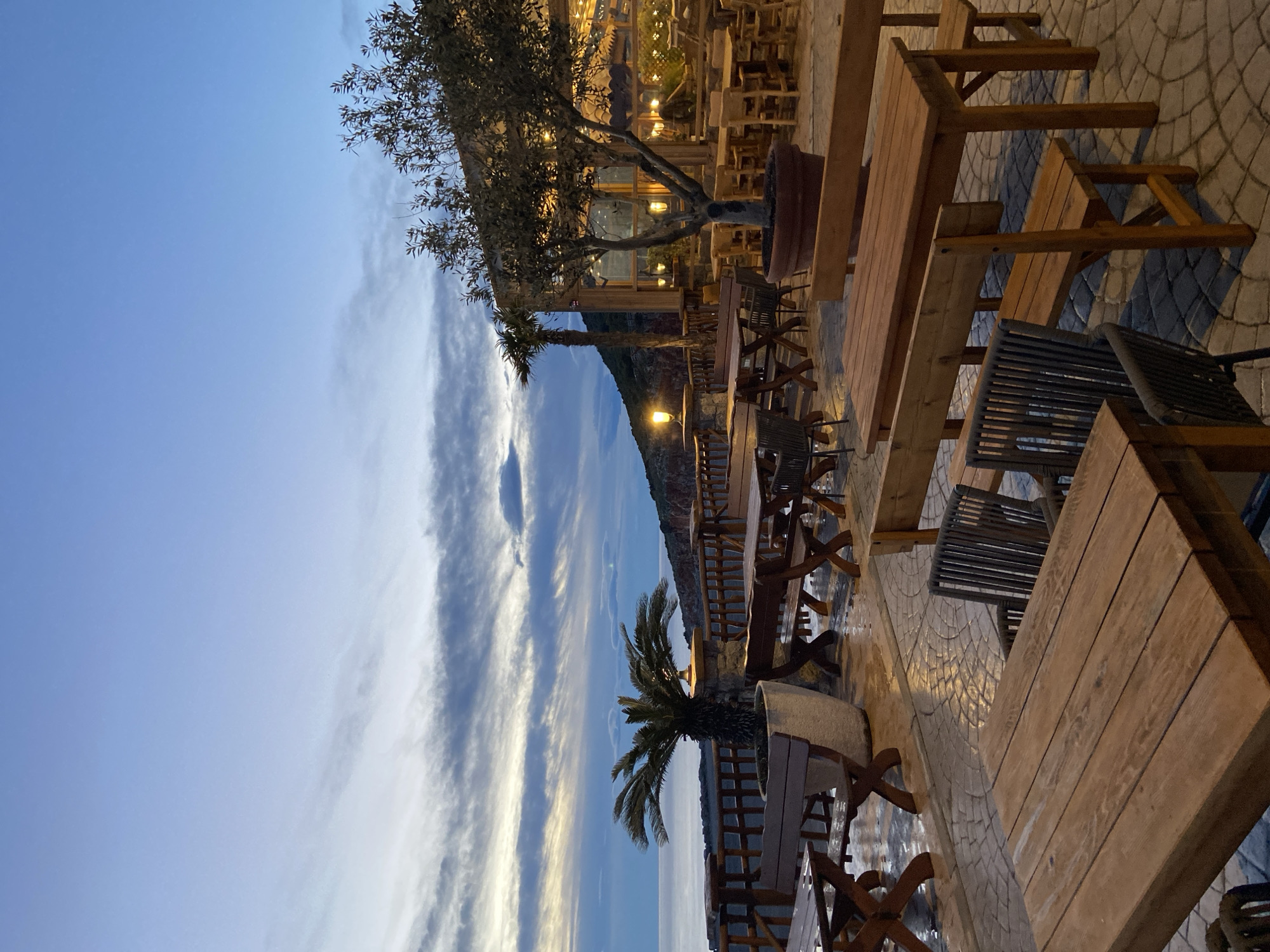 Outdoor dining area with wooden tables and chairs on a stone-paved surface. A tree and a palm tree are present near the tables. In the background, a coastal landscape is visible under a sky with layered clouds. The location appears to be Kovačko Polje, Montenegro. No people are visible.