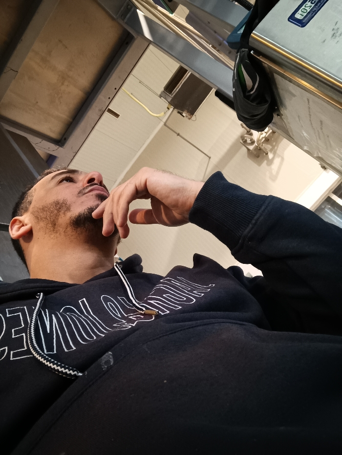 A man lies down, looking upwards with a thoughtful expression. He wears a black hooded sweatshirt with white lettering and a black cuff. His hand is near his face, suggesting contemplation. The background includes industrial-style ceilings and fixtures, creating an indoor, perhaps workplace setting. A piece of equipment with digital display is visible, possibly a scale. The perspective is from a low angle.