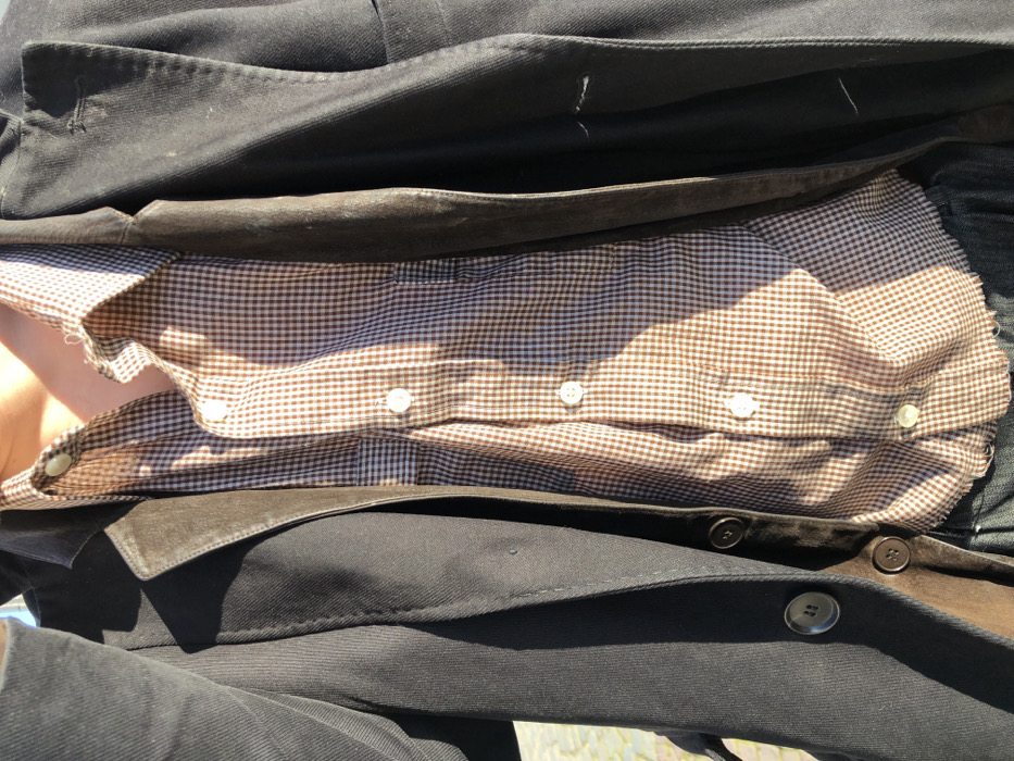 A close-up, chest-level shot captures an individual outdoors in Paris, France, illuminated by direct sunlight. The subject wears a layered outfit. The outermost garment is an open, dark-colored jacket or coat, possibly black or dark grey, featuring a visible button on the lower left front. Beneath this, a dark brown inner layer, appearing to be a vest or jacket made of leather or suede, is partially visible, showing one dark button. The innermost visible garment is a long-sleeved button-up shirt with a small brown and white gingham pattern, several white buttons down the front placket, and the top button unfastened. A segment of the person's neck is visible above the shirt collar. At the bottom of the frame, dark blue denim fabric is discernible. Strong, defined shadows are cast across the clothing due to the bright outdoor lighting. The background is out of focus, revealing a light-colored, possibly paved ground surface.