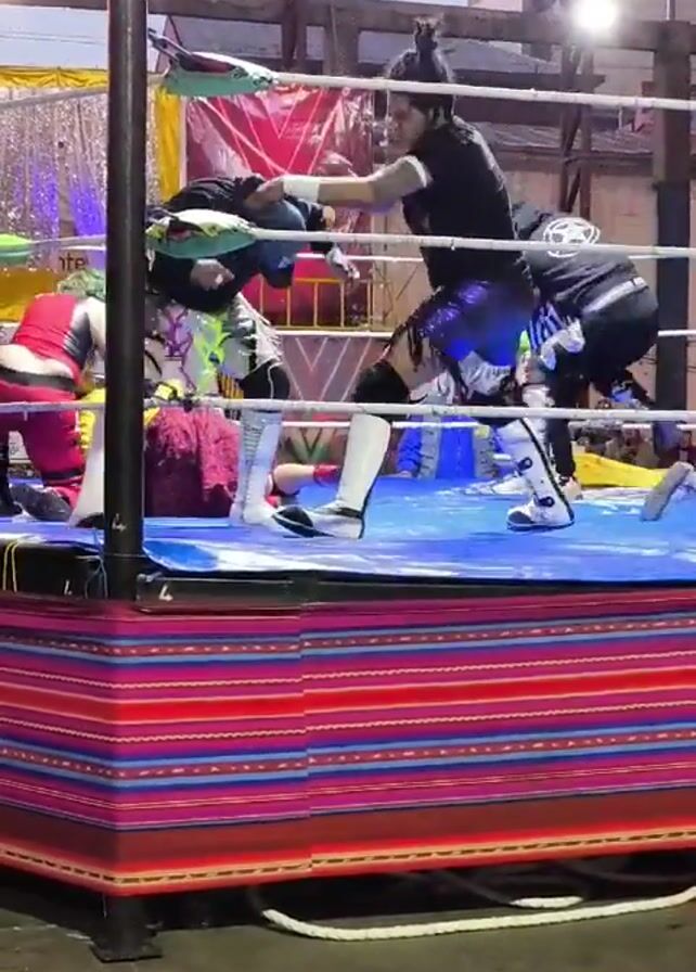 A wrestling match is taking place inside a wrestling ring. The ring's base is wrapped in a brightly colored, striped fabric. Four wrestlers are in the ring, each wearing different wrestling attire. Two wrestlers are in the center of the ring, grappling with each other. One has a blue cap and the other has long dark hair in a top knot. The other two wrestlers are near the ropes, one on his knees. Spectators can be seen outside the ring. The environment is a large, industrial-looking space, possibly a warehouse or arena, with a high ceiling and exposed beams. The lighting is uneven, with some bright spots and shadows.