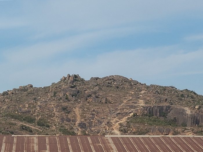 A rocky, barren hill dominates the scene beneath a blue sky with light clouds. The hill is covered in rocks and sparse vegetation, with a visible path winding towards the summit. A flat rock formation appears mid-hill. In the foreground, the top of a corrugated metal roof is visible, suggesting the viewpoint is from a building.