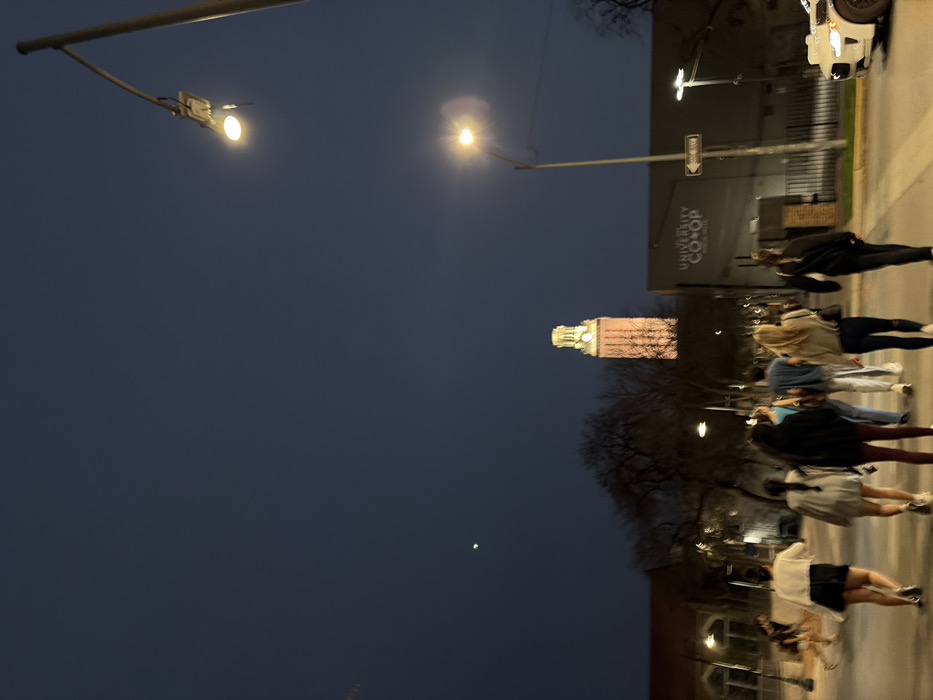 The image depicts a nighttime urban scene in Austin, Texas, United States of America, specifically near the University of Texas at Austin campus