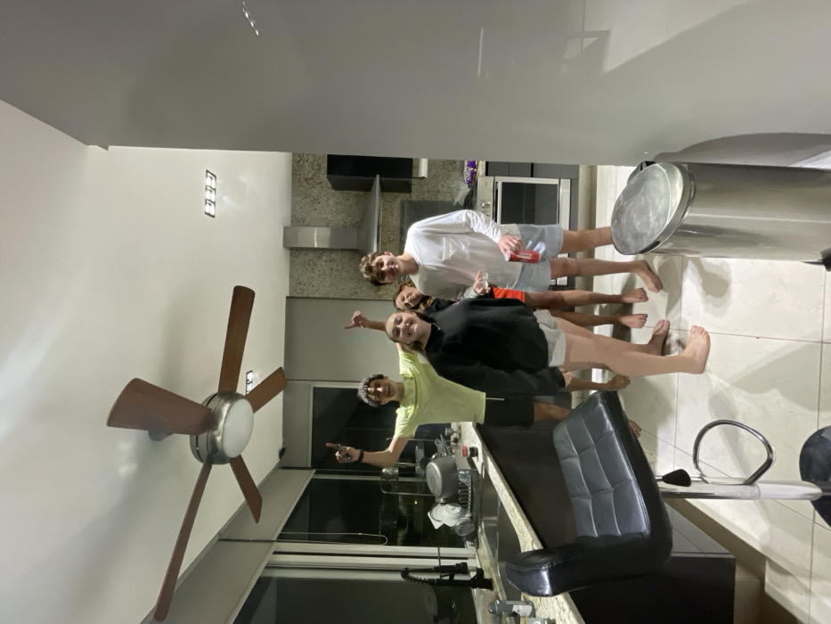 Four young people stand barefoot in a modern kitchen. The person closest to the camera wears a lime green shirt and points to a ceiling fan. Behind them, a person in a black hoodie points upward. Another person wears a white shirt and holds a drink. The fourth is in between. The kitchen has sleek countertops, stainless steel appliances, and a dark chair. Large windows are visible in the background. The image is taken from a low angle, making the subjects appear taller.