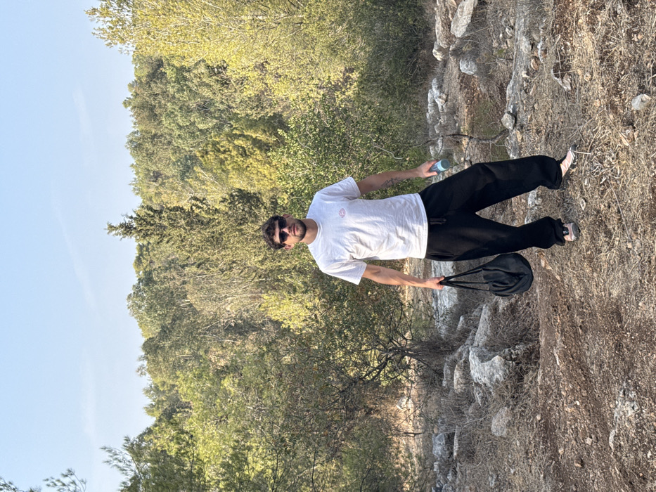 A male individual is standing on an uneven, dry, and rocky path within a natural, forested area of Modi'in-Maccabim-Re'ut, Israel. The subject, estimated to be in his late 20s or early 30s, is centered in the frame, facing directly forward. He is wearing dark sunglasses, a light-colored (possibly off-white) short-sleeved t-shirt with a small, light pink graphic on the left chest, loose-fitting black sweatpants, and light-colored sneakers. In his left hand, he holds a black fabric drawstring bag, while his right hand holds a light blue cylindrical object, possibly a water bottle or spray can. The immediate foreground consists of dry, reddish-brown earth, sparse dry vegetation, and scattered light grey stones and rocks. The background features a dense, verdant forest with a variety of tree species, displaying shades of green and some lighter yellowish-green foliage under a clear, light blue sky.