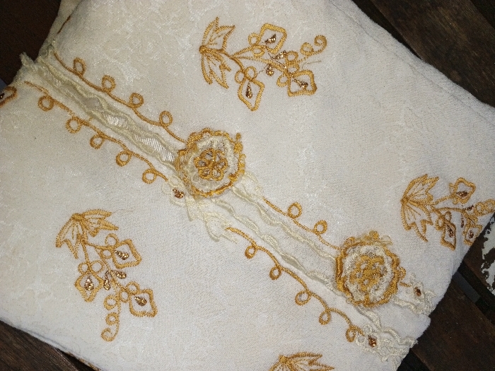 The image depicts a folded, off-white textured textile, likely a towel or small blanket, positioned on a dark brown wooden surface with visible grain. The textile is extensively decorated with gold-toned embroidery and embellishments. A central diagonal band features a light beige ruffled ribbon bordered by golden embroidered scrollwork. Two prominent, multi-layered circular fabric rosettes, rendered in gold and cream, are affixed to this central band. Additional gold embroidered stylized floral or vine motifs, each incorporating small, reflective gold or amber-colored beads, are distributed across the textile. No human subjects or interactions are present. The scene is static, set in Unknown, Unknown.
