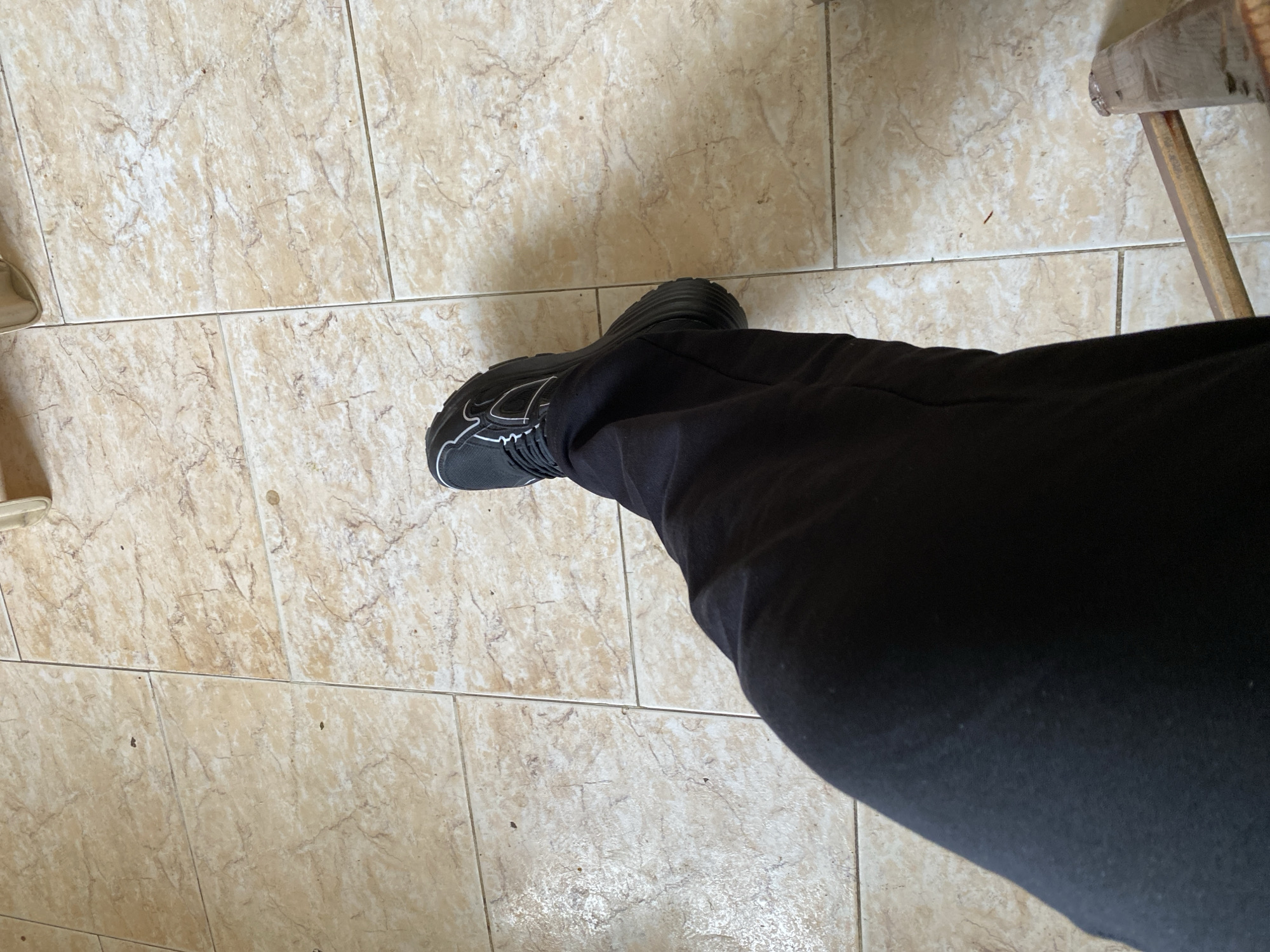 A high-angle view captures a single human leg and foot resting on a tiled floor in Baraki, Algeria. The leg is encased in dark, possibly black, fabric trousers. The foot is adorned with a black athletic shoe featuring white outline details, white laces, and a robust black sole with visible treads. The floor is composed of rectangular light beige ceramic tiles, each displaying a subtle marbled pattern and demarcated by thin grout lines. A segment of a light-colored wooden chair, showing some wear, is visible at the lower right edge of the frame, suggesting the person is seated. A faint, lighter-toned object, possibly another furniture leg, is partially visible at the top right.