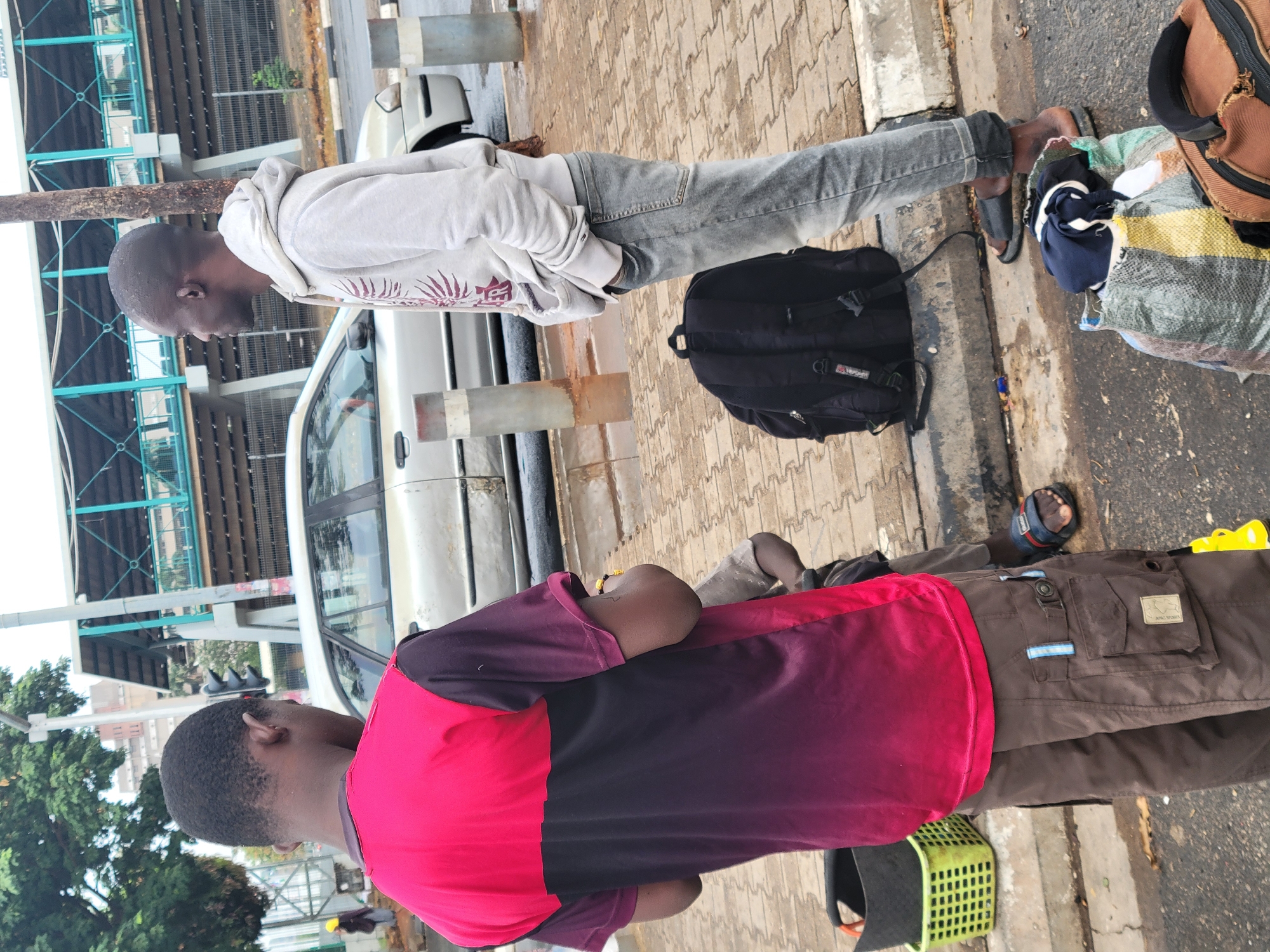 Two men stand on a paved sidewalk next to a street in Abuja, Nigeria. The first man, closer to the camera, wears a magenta and black shirt and brown pants. His arms are crossed. A green plastic crate sits nearby. The second man wears a grey hooded sweatshirt, light grey jeans, and black shoes. A black backpack lies on the ground next to him, along with a pile of mixed fabrics and a brown backpack. Behind the men, a light-colored car is parked next to a pedestrian overpass. Traffic lights are visible in the background. The sidewalk is paved with interlocking concrete pavers.