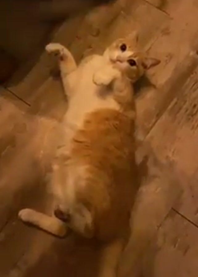 A medium shot depicts an orange and white cat lying on its back on a wooden floor