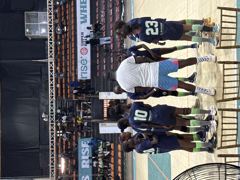 An indoor sports arena in Iganmu, Nigeria, hosts a volleyball match or practice session. In the foreground, a group of approximately eight young female athletes, clad in dark blue jerseys with "LEGION VOLLEYBALL" and numbers (including 10, 20, and 23) visible, are huddled around a male coach. The coach, facing the players with his back to the viewer, wears a white t-shirt, blue and pink patterned shorts, white socks, and white athletic shoes. The players wear various athletic footwear, and some have knee pads or leg wraps, with several displaying neon green and grey gradient socks. A white volleyball is suspended in the air above the huddle, slightly off-center to the left. The playing surface is a light-colored court with distinct green and blue boundary lines. In the mid-ground and background, multiple tiers of orange stadium seating rise upwards. A significant number of spectators are seated or standing in these bleachers, observing the scene. Some spectators include individuals in green and white school uniforms. Above the lower seating tiers, advertising banners are displayed, featuring text such as "RISE," "SUPER BALL," and a partial "WHE." A man in a red suit jacket and dark trousers stands on a staircase in the seating area. Overhead, a complex truss structure supports numerous spotlights. A large black curtain or backdrop covers the upper walls of the arena. Partially visible in the bottom left foreground are the metal grates of a large industrial fan, and two empty wooden chairs are in the bottom center.