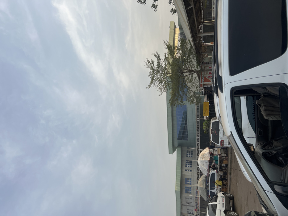 The image depicts an outdoor urban environment, specifically a bustling market area situated in Ado, Nigeria. The scene is observed from a slightly elevated perspective, with a significant portion of the lower frame occupied by vehicles. In the immediate foreground on the right, a white minivan or SUV is prominently visible, its driver's side facing the viewer. The vehicle's tinted windows obscure its occupants, but a beige or light brown bag rests on the passenger seat, partially visible through the open window. A roof rack is present on the vehicle. To the left of this vehicle, another white SUV is partially visible. The midground features an active informal market. Several stalls, each covered by a light-colored, possibly white, tarpaulin or umbrella, are set up. People are engaged in activity around these stalls; at least one individual wearing a yellow top is seated behind a stall, partially obscured. Goods are displayed on tables beneath the coverings. Numerous other vehicles, including cars and vans of various colors, are either parked or slowly moving through this market area, suggesting a dynamic commercial zone. The ground in this section appears unpaved or dusty. Dominating the background is a large, modern multi-story building characterized by a light green or teal roof and wall sections. The building features extensive blue-tinted reflective glass windows, particularly in its upper central and right sections. A large red sign with white lettering, partially legible as "ZAMRAT YAN HAMGA," is affixed to the building's left facade. Below this, smaller rectangular windows are visible. A verdant, deciduous tree stands directly in front of the central portion of this building, partially obscuring it. Another tree is partially visible on the far right of the frame, behind the market canopy. The sky above is overcast with scattered, light grey clouds, indicating daylight conditions.