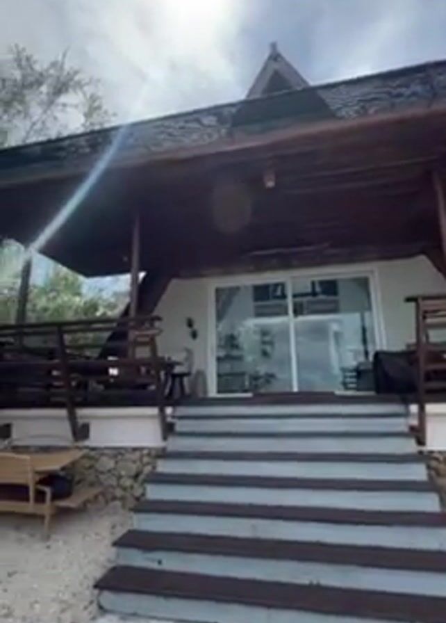 low-angle view of a single-story house with a wooden A-frame roof and a wide porch, then pans right to reveal a sandy beach and calm, clear water. The house has a large set of sliding glass doors. A set of gray and dark brown steps leads up to the porch. A wooden bench is visible on the porch. Beyond the house, the video pans to the right, showing a beach with light-colored sand and scattered debris. Trees line the edge of the beach. The water is calm and clear with some mangroves growing in it. The sky is cloudy with patches of blue.