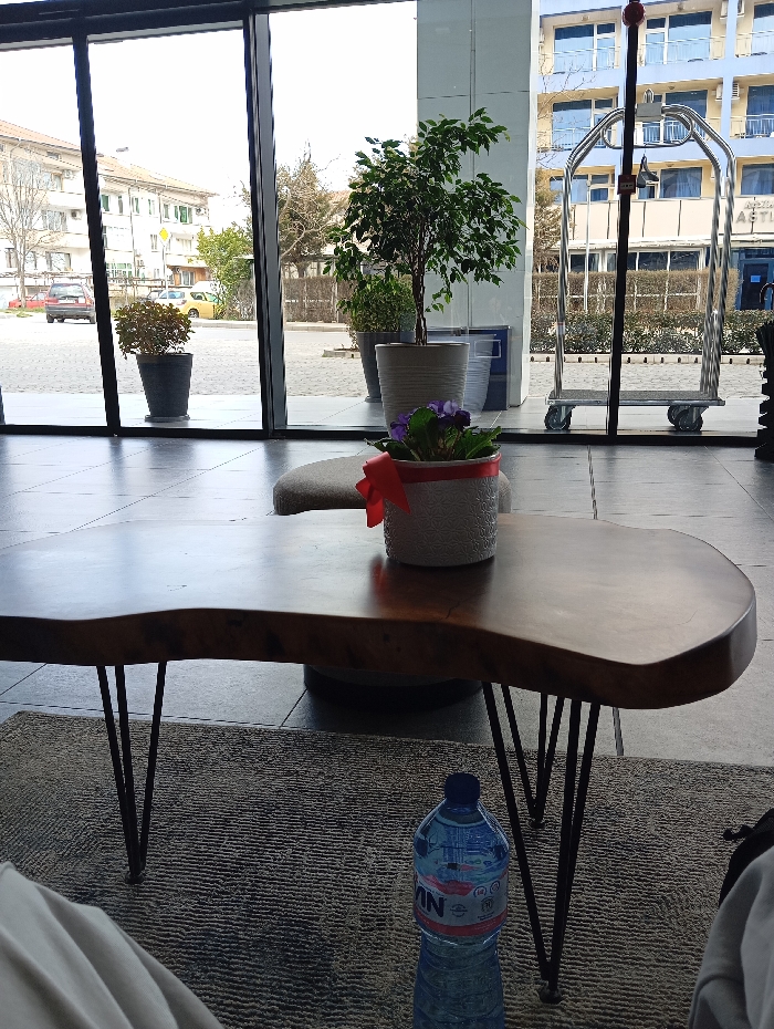 The image depicts an indoor lobby or waiting area looking out through a large glass facade onto a street in Hisarya, Bulgaria, directly opposite the Hotel Astoria. In the foreground, the lower portion of a person's light-colored leg is visible on the left, next to a blue "DEVIN" brand mineral water bottle placed on a textured grey rug. A wooden coffee table with an irregular, organic-shaped top and black metal hairpin legs is centered. On the table, a white, embossed pot holds purple flowering plants (African violets) and is decorated with a red ribbon. A grey upholstered stool is partially visible behind the table. Through the glass windows, an outdoor scene unfolds. On the street, a dark-colored sedan and a yellow vehicle are parked. To the left, several multi-story buildings with light-colored facades are visible. To the right, prominently positioned across the street, is the Hotel Astoria, identifiable by its distinctive light blue facade and numerous windows. Sparse trees and shrubs are present outdoors. Inside, near the windows, several potted plants, including a larger leafy tree, are arranged. A chrome luggage cart with a red-tipped handle stands upright near the right side of the window frame. The indoor floor is dark-colored tile beneath the rug.