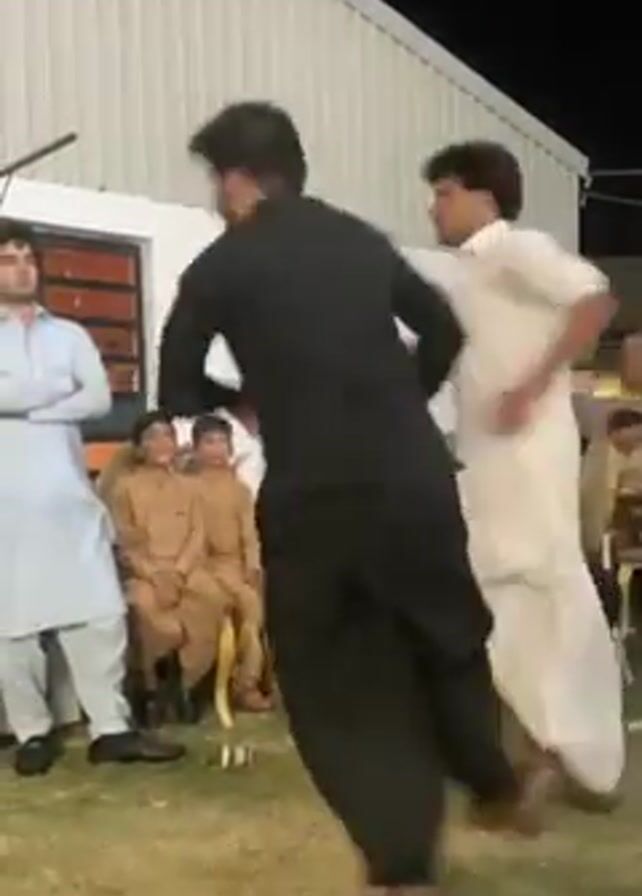 man dancing in front of a seated audience. The man is wearing a black traditional outfit and brown shoes, and has a mustache. He is moving his arms and legs in a lively manner, and appears to be enjoying himself. There is another man dressed in white dancing next to him. Several people are seated behind them, watching the performance, some are dressed in brown outfits. A table with a silver samovar is visible in the background. The event takes place outdoors, on grass, with a white wall forming the backdrop. The lighting suggests it is evening. The atmosphere appears festive.