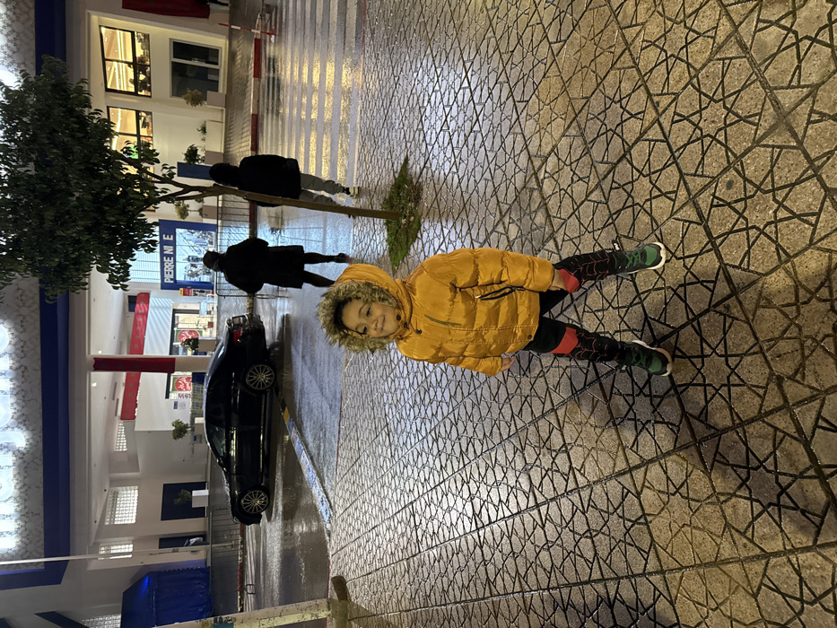 A young child wearing a yellow winter coat with a hood stands on a patterned stone sidewalk. Two adults in dark coats walk behind, near a black car and a business storefront. The sidewalk is wet, reflecting light. A small tree grows nearby. The scene appears to be at night, illuminated by artificial lighting.