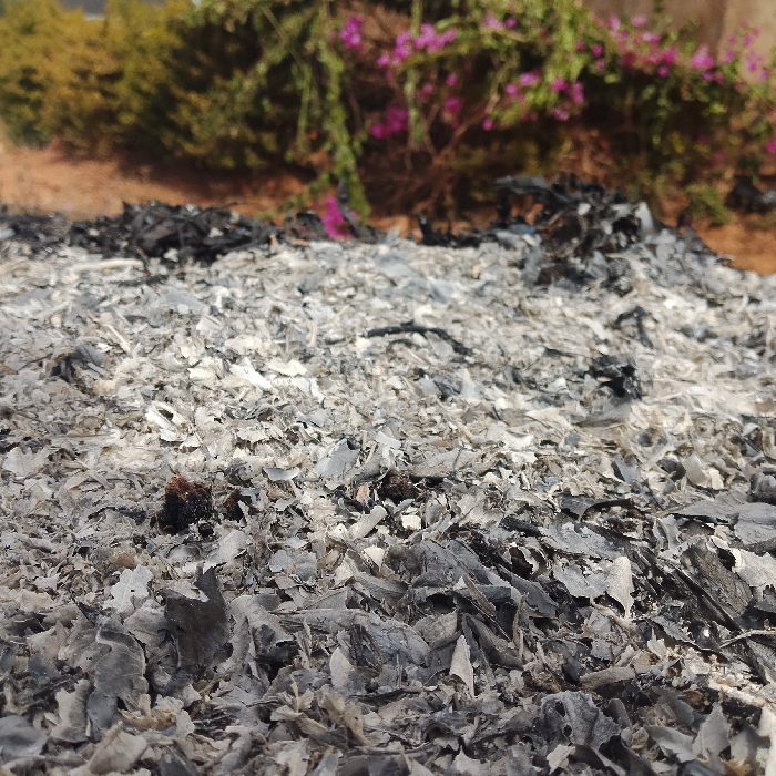 The scene is situated in Narayi, Nigeria. The foreground is covered by an extensive, uneven layer of light grey and black ash, consistent with the residue of a recent combustion event. This ash comprises numerous fragmented, charred organic particles, with darker, more substantial burnt remnants scattered throughout. Behind the ash layer, a section of reddish-brown soil is visible. The background features blurred green foliage from various bushes and plants, notably including clusters of vibrant pink flowers, suggesting a garden or cultivated landscape. The environment is illuminated by natural daylight. No people, active subjects, or specific interactions are observed within the frame.