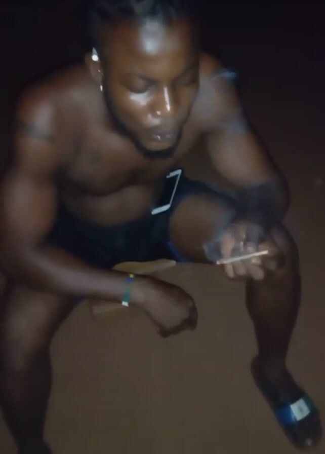 A man with braided hair, who is shirtless and wearing shorts and slides, is sitting on the ground. He is holding a lit cigarette in his hand and exhaling smoke. A cell phone is visible in the back of his shorts. The background is dark.