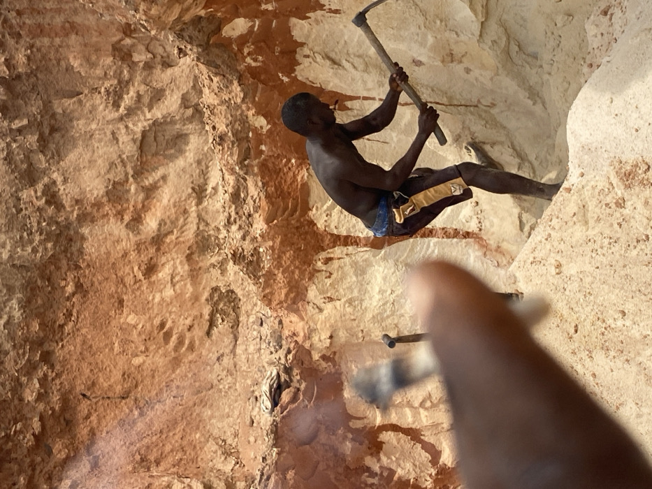 The image depicts an outdoor excavation site in Ufueseni, Nigeria. The environment consists of a large, exposed earthen wall with distinct stratifications: the upper section is reddish-brown with darker vertical streaks, while the lower section is composed of lighter, off-white granular material. A significant pile of this light-colored granular material is accumulated in the foreground and midground. A dark-skinned adult male is positioned in the midground, standing barefoot on the granular pile. He is shirtless, wearing dark shorts with a yellow stripe on the side and a visible blue waistband. He is bent forward, holding a pickaxe with a wooden handle and metal head with both hands, directed towards the granular material. A small, dark object is present in his mouth. In the left midground, partially obscured by a blurry dark-skinned finger extending from the extreme left foreground, two additional metal-headed digging implements with dark handles are standing upright in the ground. A piece of light-colored fabric or clothing is visible on a ledge in the upper reddish-brown section of the earthen wall. The scene is brightly lit by natural light.