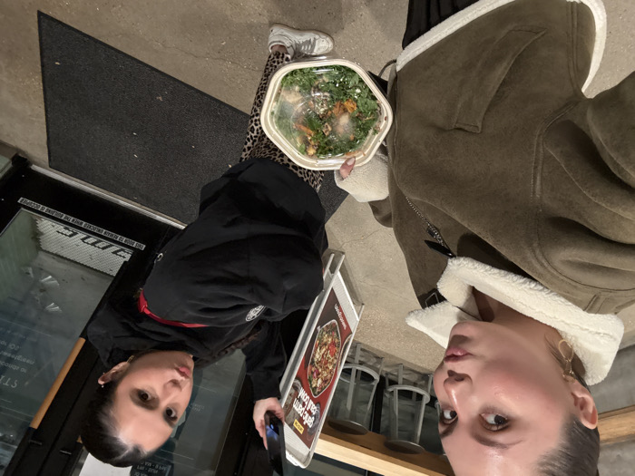 Two women stand indoors near an entrance with a black mat. The woman on the left wears a black hoodie with a red trim and animal-print pants, holding a salad. The woman on the right sports a brown suede jacket with white faux fur trim. Transparent glasses are visible behind them. The image is taken from a high angle.