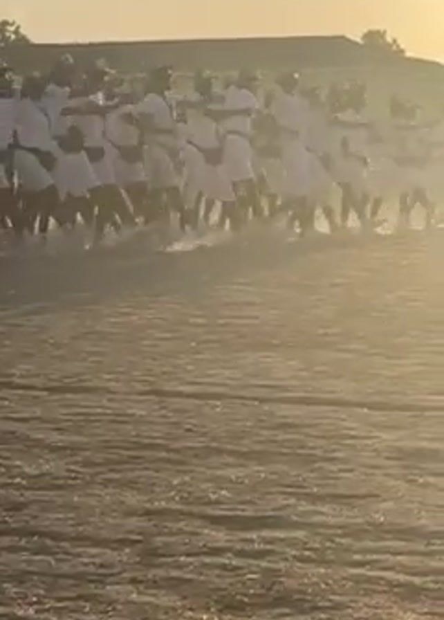 A group of people wearing what appears to be white uniforms are performing a synchronized dance or marching routine on a dirt field