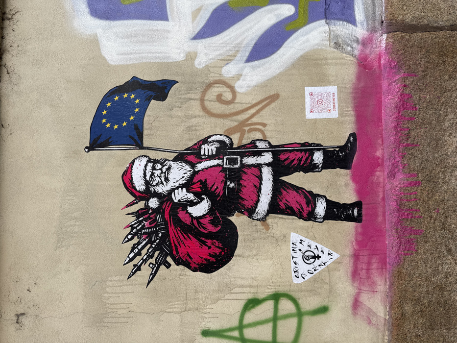 This image depicts a piece of street art on a distressed light beige wall, located in Milan, Italy. The central subject is a stylized figure resembling Santa Claus, rendered primarily in black, magenta, and white. He wears a magenta suit with white trim, black boots, a black belt, and a magenta hat with a white pompom, alongside a prominent white beard and mustache. Santa is shown carrying a large, overflowing magenta sack on his left shoulder, which contains multiple grey and red-tipped missiles and what appear to be firearms. In his right hand, he holds a pole from which a dark blue flag of the European Union, featuring a circle of twelve yellow stars, unfurls to the right. The wall surface exhibits signs of age, including discoloration and streaks. To the left of the Santa figure, a green spray-painted symbol resembling an 'A' within a circle is visible. Below and to the left of the figure, a white triangular sticker displays black text, including "CRISTINA DONATELIA," and a female gender symbol enclosing a raised fist. To the right, a small white rectangular sticker contains a pink QR code and the text "CDONATIMEYER." Further right, faint purple and white spray paint marks are present. The lower portion of the wall and an underlying dark, coarse concrete or stone base are heavily marked with vibrant pink spray paint, characterized by numerous vertical drips.
