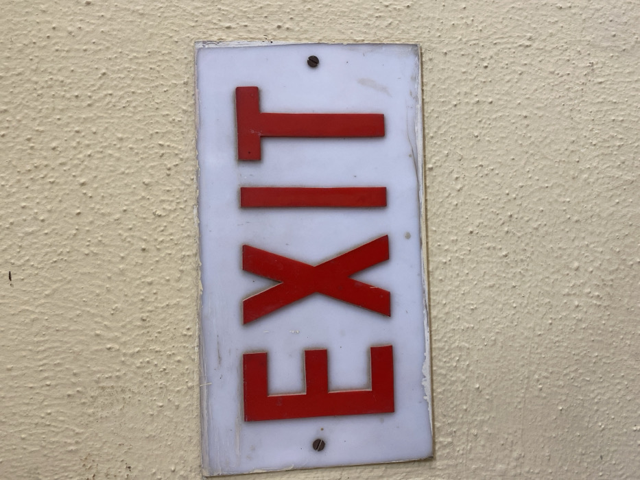 - "The image displays a rectangular "EXIT" sign mounted horizontally on a textured, light yellow or beige wall in Shaba, Nigeria" by FM-MBbol1, licensed under CC BY 4.0