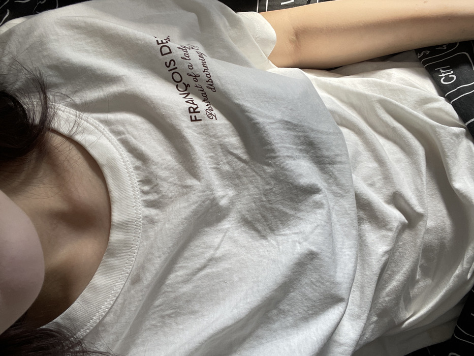 A close-up, downward-angled photograph depicts the upper torso and neck of an individual in Saint Petersburg, Russia. The subject has fair skin, with visible dark hair near the left shoulder. They are wearing a light-colored, possibly off-white or cream, short-sleeved t-shirt with visible creases. On the upper right chest of the t-shirt, dark red text is embroidered or printed, stating "FRANÇOIS DE" on the top line, followed by "Portrait of a lady disarming &" below it. A second layer of light-colored, crumpled fabric is visible beneath the t-shirt. To the lower right, a portion of a bare arm is exposed. The bottom right corner of the frame shows a black fabric patterned with white outlines of keyboard keys, specifically "Ctrl," "S," "4," and "5," suggesting a blanket or apparel item. The individual is static, and no discernible actions or interactions are captured. The scene appears to be an indoor setting.