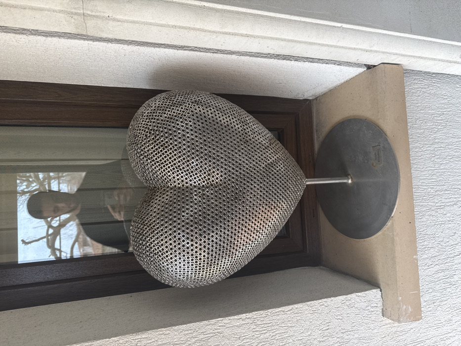 A metallic, heart-shaped sculpture composed of numerous interconnected rings rests on a circular base and slender stand, placed on an exterior stone windowsill in Lozenets, Bulgaria
