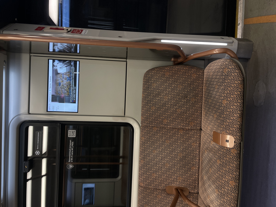 Inside a train car, patterned seats sit adjacent to a window displaying a QR code and a snowflake symbol indicating air conditioning. Above the window, a screen shows news or transit information. A copper-colored handrail runs along the top of the seats and window area, with a light strip above. The walls are a light, neutral color.