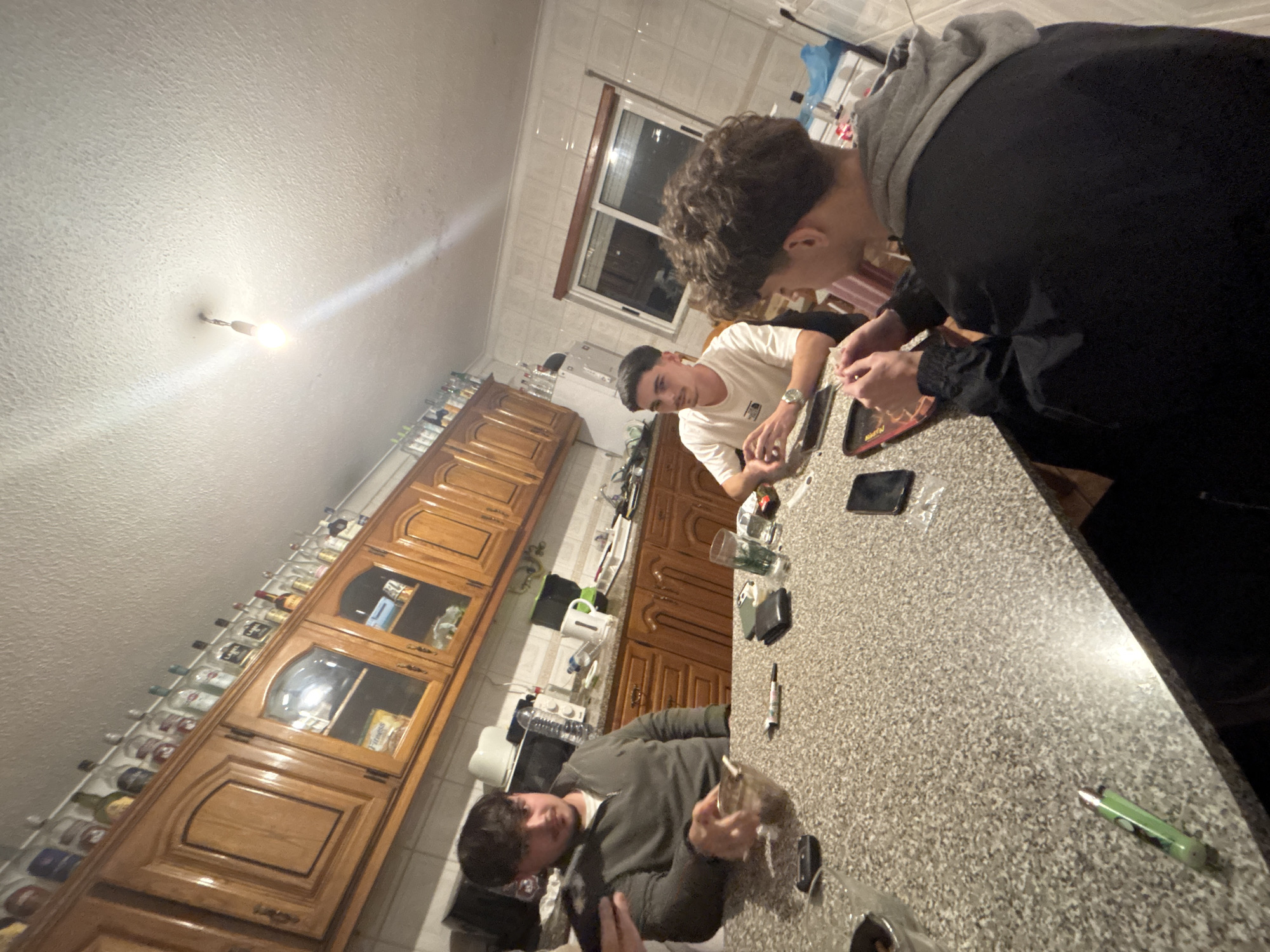 The image depicts three young adult males gathered around a speckled countertop in what appears to be a residential kitchen or dining area in Bragança, Portugal. **Environment:** The room is illuminated by a single, bare light bulb hanging from a textured white ceiling. The background features light wooden kitchen cabinets with arched panels, some with glass doors, and a white tiled backsplash. Numerous liquor bottles are arranged on top of the upper cabinets. A white-framed window is visible to the right. A microwave, a white kettle, and various bottles and containers are present on the countertop behind the individuals. **Individuals:** 1. **Left:** A male with dark hair and stubble, wearing a dark olive green quarter-zip sweatshirt, is seated or standing. His left hand holds a clear glass bowl containing dark, granular material. His right hand is positioned near the bowl. He is looking forward, possibly towards the camera. A black smartphone held by an unseen individual is partially visible in the extreme left foreground, pointing towards him. 2. **Middle:** A male with short dark hair, wearing a light-colored t-shirt, is seated. He has a watch on his left wrist. His hands are clasped on the table in front of him, and he is looking towards the right. A dark smartphone is on the table in front of him. 3. **Right:** A male with curly dark hair, wearing a grey hooded sweatshirt under a black jacket, is seated with his back mostly to the camera. His hands are engaged in manipulating a small object on a red rectangular tray positioned on the table. **Objects on the Countertop:** The speckled gray countertop displays several items. Near the left individual, there is a green disposable lighter, a black smartphone, and a small black rectangular object, possibly a wallet. In front of the middle individual, there is a clear drinking glass containing liquid and a dark smartphone. In front of the right individual, a red rectangular tray contains small items being handled. The clear glass bowl with dark contents is centrally located near the left individual.