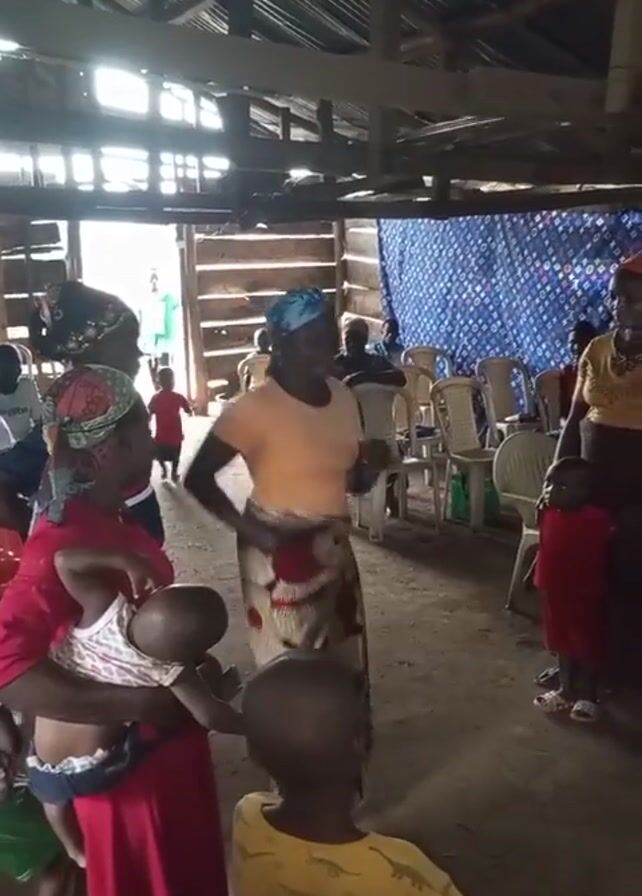 group of people inside what appears to be a community hall or church-like structure with a simple roof and open walls. Several adults, mostly women, and children are present. The adults are dressed in colorful clothing, some wearing headwraps. One woman in a patterned dress dances in the center of the space. Others are standing or sitting on chairs arranged within the room. A woman is holding a baby. There is natural light entering from an opening in the building. The floor appears to be dirt or concrete. There is a blue and white patterned fabric hung on one wall. The overall atmosphere seems informal and communal.