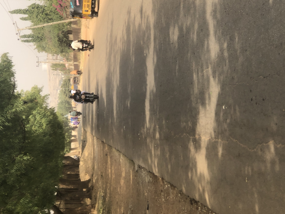 A vertical outdoor shot displays a paved road with vehicles and pedestrians. Several motorcycles are moving on the road's right side, appearing smaller in the distance. A yellow motorized tricycle is visible at the top of the frame. Trees line the road's left side, with the sidewalk area appearing uneven. The road surface features patches of light and dark areas, likely due to shadows.