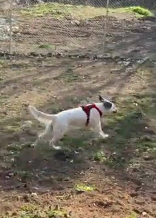 A white and gray medium-sized dog wearing a red harness runs through a grassy, dirt-covered area. The dog runs across the frame and off to the right. In the background, there is a chain link fence, some metal poles, a parked white car, and some bare trees. The light is bright and casts shadows on the ground.