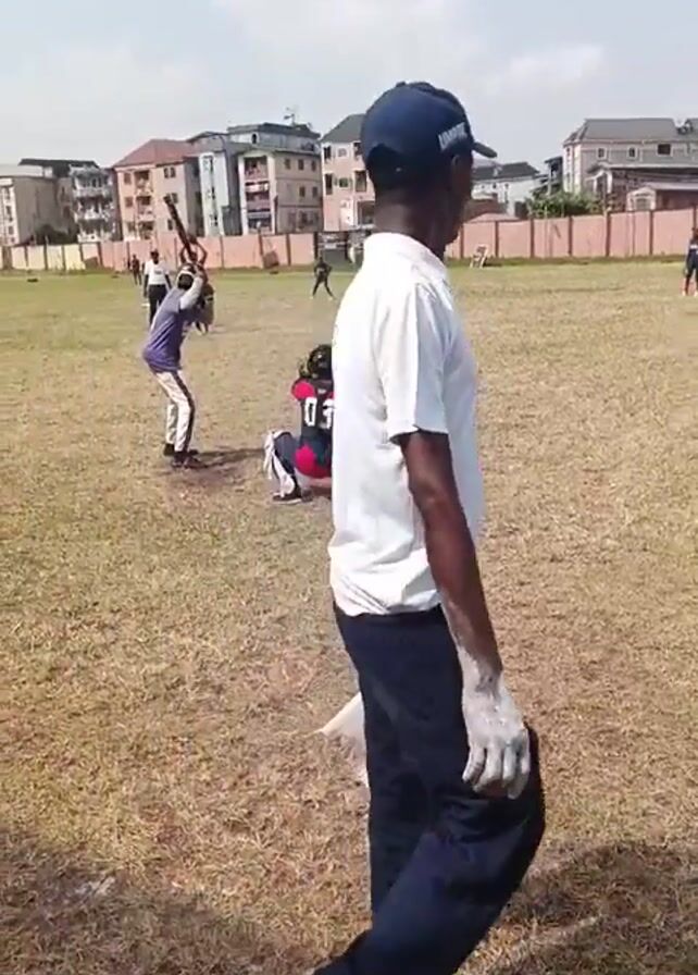 baseball game in progress on a grassy field, likely an amateur or youth league
