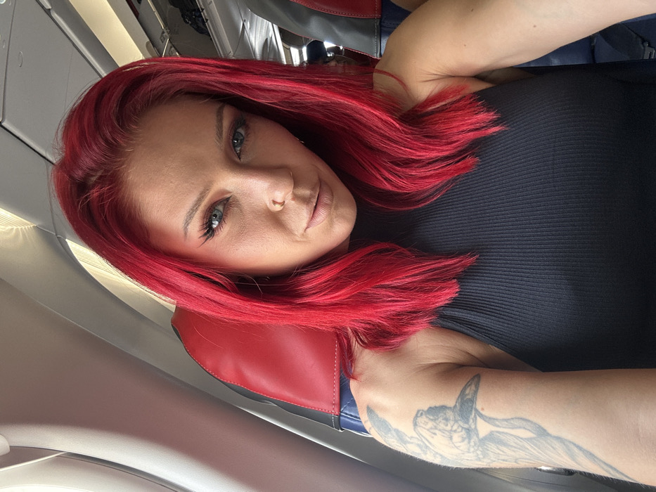 The image displays a female individual inside an airplane cabin. The subject is positioned facing forward, capturing a selfie. She has vivid red, medium-length hair, blue eyes with dark eyeliner, and a small ring piercing in her left nostril. Her expression is neutral. She is wearing a black, ribbed, sleeveless top. A faded tattoo, appearing to be an avian figure, is visible on her left upper arm. To her left, an aircraft window shows bright ambient light. Behind her, a red and dark-colored seat headrest is visible. Overhead storage compartments and cabin lighting fixtures are present in the background. The specific location within the city of Tangerang, Indonesia, cannot be precisely identified from the image, but the scene is consistent with being inside an aircraft at an airport serving Tangerang, such as Soekarno-Hatta International Airport. No interactions with other individuals are visible.