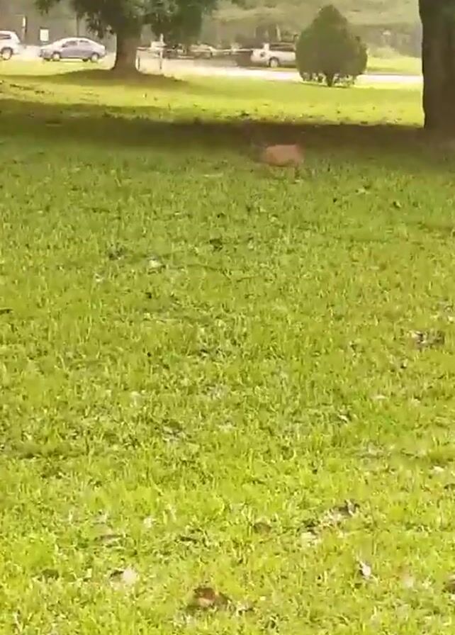 grassy lawn area surrounded by trees. In the distance, beyond the trees, are parked cars. In the middle of the lawn, there is a small, light brown deer. The deer appears to be grazing or searching for food in the grass. The overall environment seems peaceful and natural.