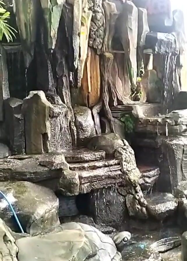 n artificial waterfall feature made of stone and concrete. The structure is multi-tiered, with water cascading down multiple levels. There's a turtle statue at the base of the waterfall. Green plants are incorporated into the design. The sunlight washes out some of the upper part of the scene.