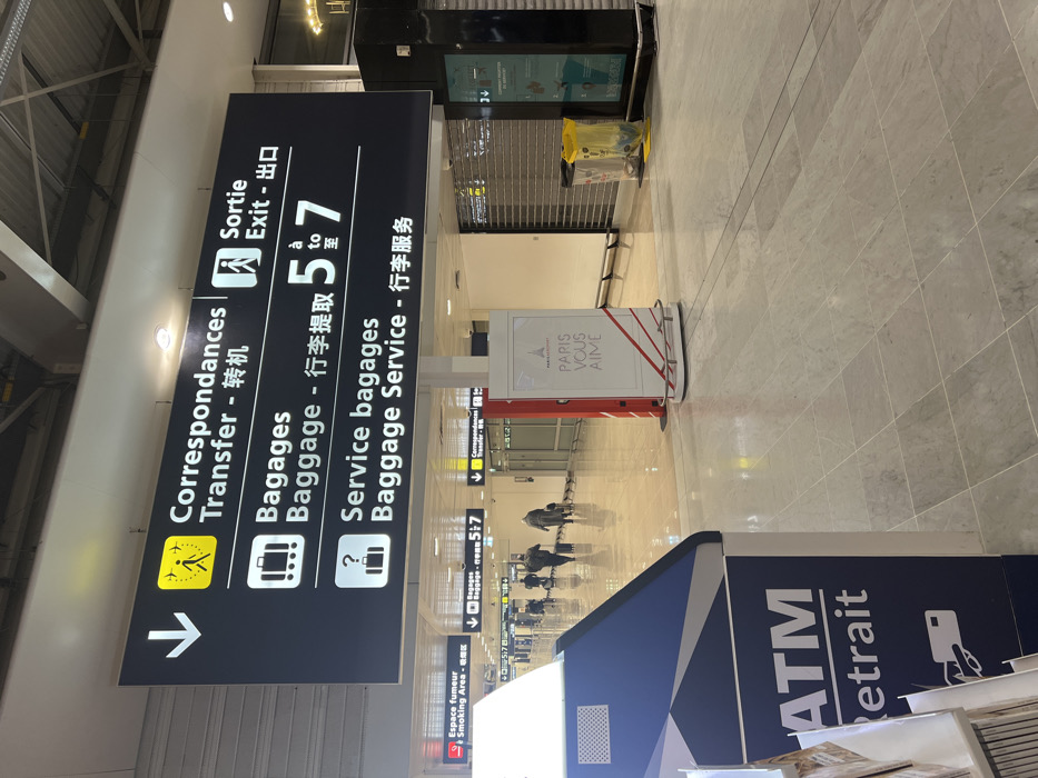 n airport interior with signage. A large black sign displays directions for "Correspondances/Transfer," "Baggage," and "Service bagages/Baggage Service," with icons and multilingual translations (Chinese). It indicates "Sortie/Exit" towards gates "5 to 7." Further along, other signs point toward smoking areas and baggage claims. An "ATM Retrait" sign is also visible. A "Paris Vous Aime" stand is present, and some people walk in the background. The floor is tiled and shiny, reflecting light.