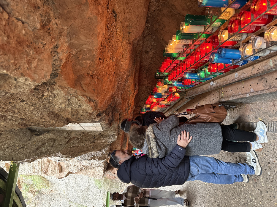 An outdoor scene captures multiple individuals engaged with a large display of votive candles in a natural rock formation, identified as the Santa Cova (Holy Cave) along the "Camí de la Santa Cova" path in Monistrol de Montserrat, Spain. In the foreground, a man and a woman stand side-by-side, facing right towards the candles. The man, on the left, wears a dark blue puffer jacket, light blue jeans, and light-colored sneakers; his right arm is around the woman's waist. The woman, to his right, wears a grey coat with a fur-lined hood, dark pants, and light blue sneakers; a brown shoulder bag hangs on her left side. Partially obscured behind her, a third individual in a dark beanie and jacket is also observing the candles. The main subject is a tiered metal rack holding hundreds of lit votive candles in glass containers. These candles exhibit various colors, including prominent reds, blues, greens, and whites, with visible flames and glowing wax. The rack extends diagonally from the mid-right to the bottom right of the frame, positioned against a textured, orange and brown natural rock wall. A small, rectangular, framed panel is embedded higher in the rock face, above and to the left of the candle display. In the background, to the far left, another man stands further back, facing right. He wears a light-colored plaid shirt, light pants, and dark shoes, holding a white object in his right hand. The ground beneath the individuals is a light-colored paved surface. Above the background man, a green metal I-beam or similar structural element is visible, with some sparse green vegetation on the natural rock face beyond it. The overall environment consists of large, rugged rock formations, characterized by a predominantly earthy color palette.