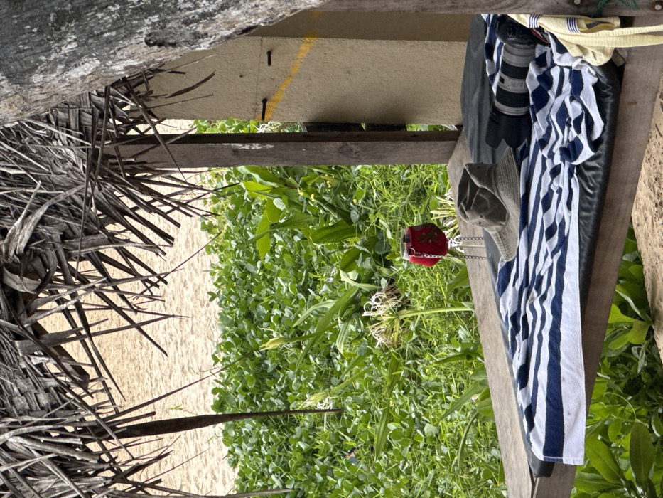 The image displays a coastal setting in Dikwella, Sri Lanka, viewed from within a rudimentary shelter. The foreground presents a structure with a roof composed of dried palm fronds. A dark wooden post supports the roof on the left side of the frame. On the right, a beige structural column features a diagonal yellow stripe and two black fixtures, partially obscured by a tree trunk. A horizontal wooden platform extends across the lower mid-ground. Upon this platform, a blue and white striped towel covers a dark mat or cushion. Positioned on the towel are a crumpled olive-green bucket hat and a black professional camera with a telephoto lens attached. A stemmed glass containing a reddish liquid, adorned with a red fabric charm and resting on a small metal stand, is placed on the wooden platform to the left of the hat. A yellow and white striped cloth is partially visible hanging off the right edge of the platform. The immediate background shows dense green coastal vegetation, including a prominent white spider lily in bloom. Beyond the vegetation, a sandy beach is visible. No individuals are present in the scene.
