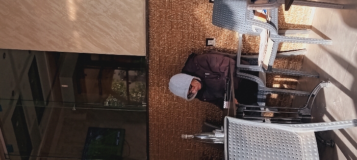 An individual is seated at a dark rectangular table in a cafe, likely in Meknes, Morocco. The person wears a grey hooded sweatshirt with the hood up, a dark jacket, and eyeglasses, focusing their attention downwards on a dark electronic device resting on the table. To their left, a clear glass bottle and a small white cup are visible on the table. The cafe environment features a golden-brown textured wall and a large glass partition reflecting a patterned ceiling and a television screen displaying green fields, possibly a sports event. Grey, perforated plastic chairs with metal frames are arranged around the table; one is occupied, another is partially visible in the foreground left, and a third to the right holds scattered papers. Sunlight illuminates the scene, casting distinct shadows on the light-colored floor.